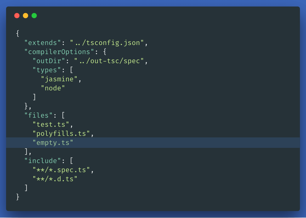 This will fix the issue for our application. But we are not done yet. There is one more step to make it work for our unit tests too: we have to add empty.ts to the files array of tsconfig.spec.json.